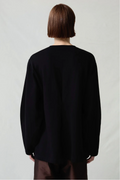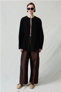 100% cotton fleece cardigan with balloon sleeves and a pintucked silhouette that flares at the hip. Fastens with hook-and-eye clasps down the front.