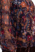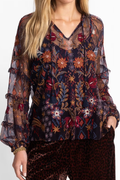 The Sapphire Mesh Blouse is crafted from a lightweight breathable mesh fabric and embellished with brilliant color and pattern. Designed with a split V-neck with a tassel closure. The slip-lined top is also embellished with bishop sleeves and intricate ruffle details.