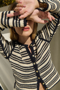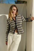 Made entirely by hand from 100% cotton, the Courtney Crochet Cardigan features a boxy, cropped fit with retro graphic appeal and timeless texture. Shell buttons catch the light—whether worn partially fastened or layered open over our best-selling Blair Tee.