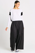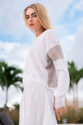 Lightweight and breathable, the 2 Tone Linen Knit is crafted from ultra-light Pima cotton with a soft, linen-like texture. This tissue-weight knit offers an easy drape ideal for warm-weather wear. Designed with a wide boat neckline and long sleeves, it features subtle color blocking from the shoulder through the front panels for a flattering, slimming effect.