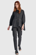 • Drawstring stretch waist, mock fly, side pockets, yoked back with patch pockets